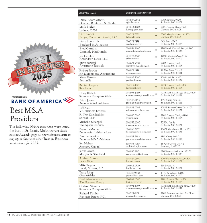 Third-Party Rating Information: St. Louis Small Business Monthly recognizes the Best M&A Providers in St. Louis in its March 2025 issue. Rating may not be representative of future results or performance. This award was created by St. Louis Small Business Monthly. The winner selection process and criteria are determined by reader surveys. Nomination received in March 2025. Archford paid no fee for participation in the award rating. View More
