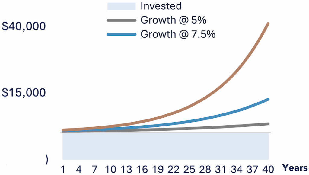 To note: Onetime initial investment of $1k, no additions, compounded annually at 5%, 7.5% and 10%, shown for 40 years. This is a hypothetical example and is not representative of any specific situation. Your results will vary. The hypothetical rates of return used do not reflect the deduction of fees and charges inherent to investing.