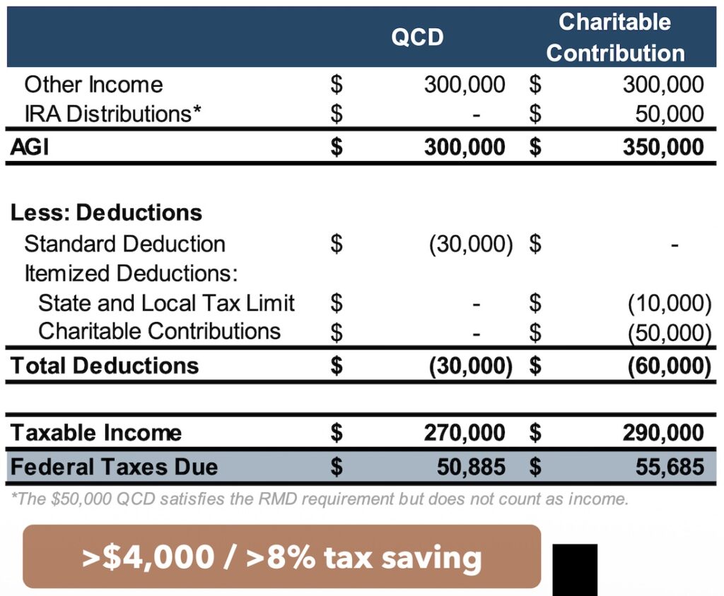 - A QCD can satisfy the RMD requirement while helping a charity and lowering taxes
